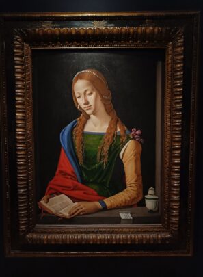 Quale miglior scelta, allora, di un quadro che presenta Santa Maria Maddalena come una giovane del suo tempo: seduta a leggere, con un cerchietto di perle tra i capelli e un abito colorato, dal gusto contemporaneo.