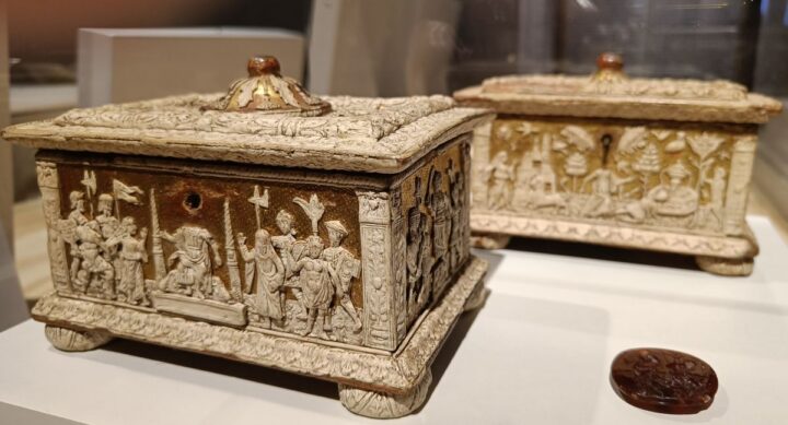 Ecco allora i cofanetti splendidamente intarsiati e le cassapanche create per contenere o esporre i doni di nozze; e poi i libri di preghiere con preziose miniature; il vasellame; piatti, bicchieri e calici; coltelli, stoffe e tovaglie; anelli e gioielli. Tutti oggetti di cui le donne si servivano o che ricevevano in dono.