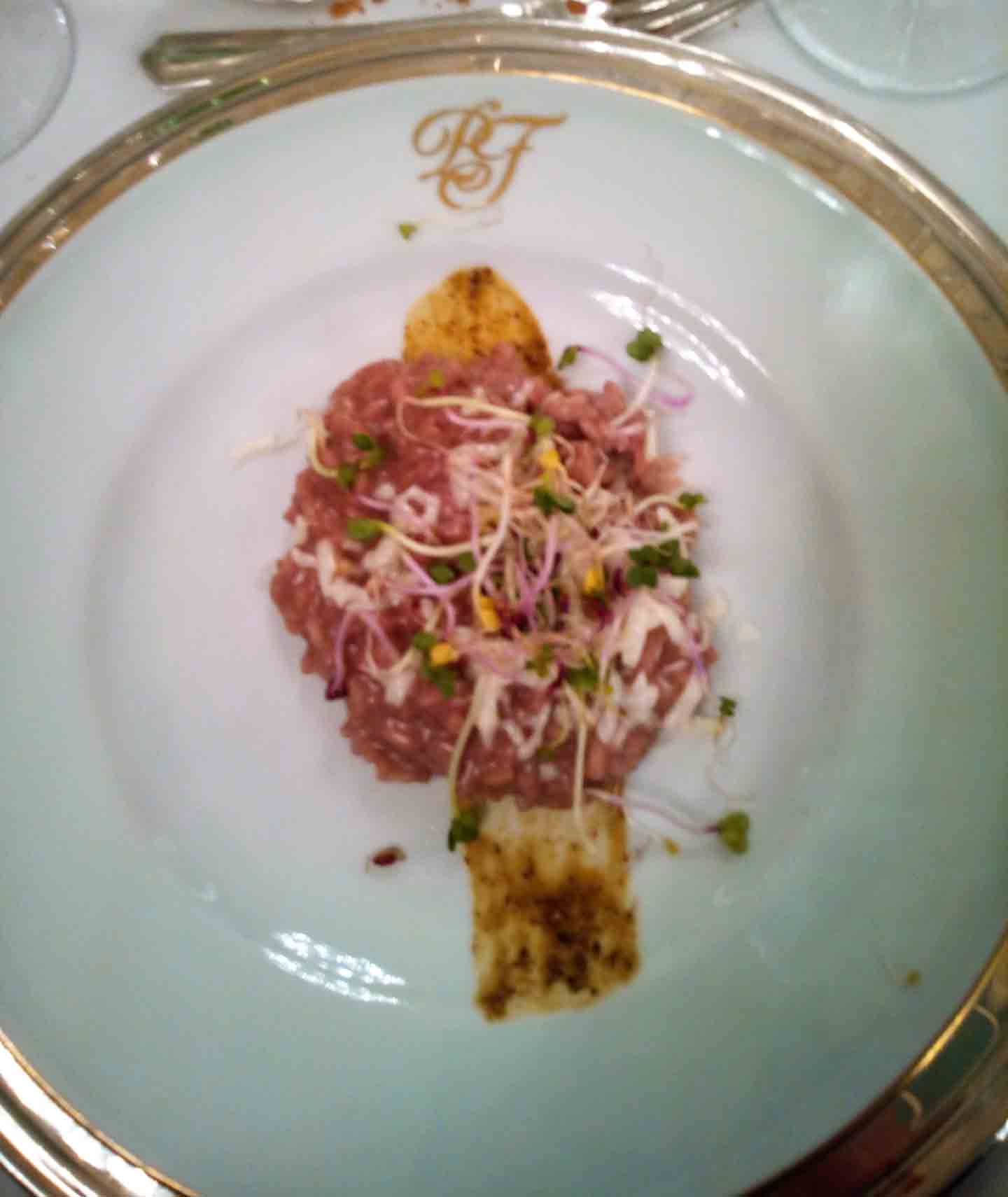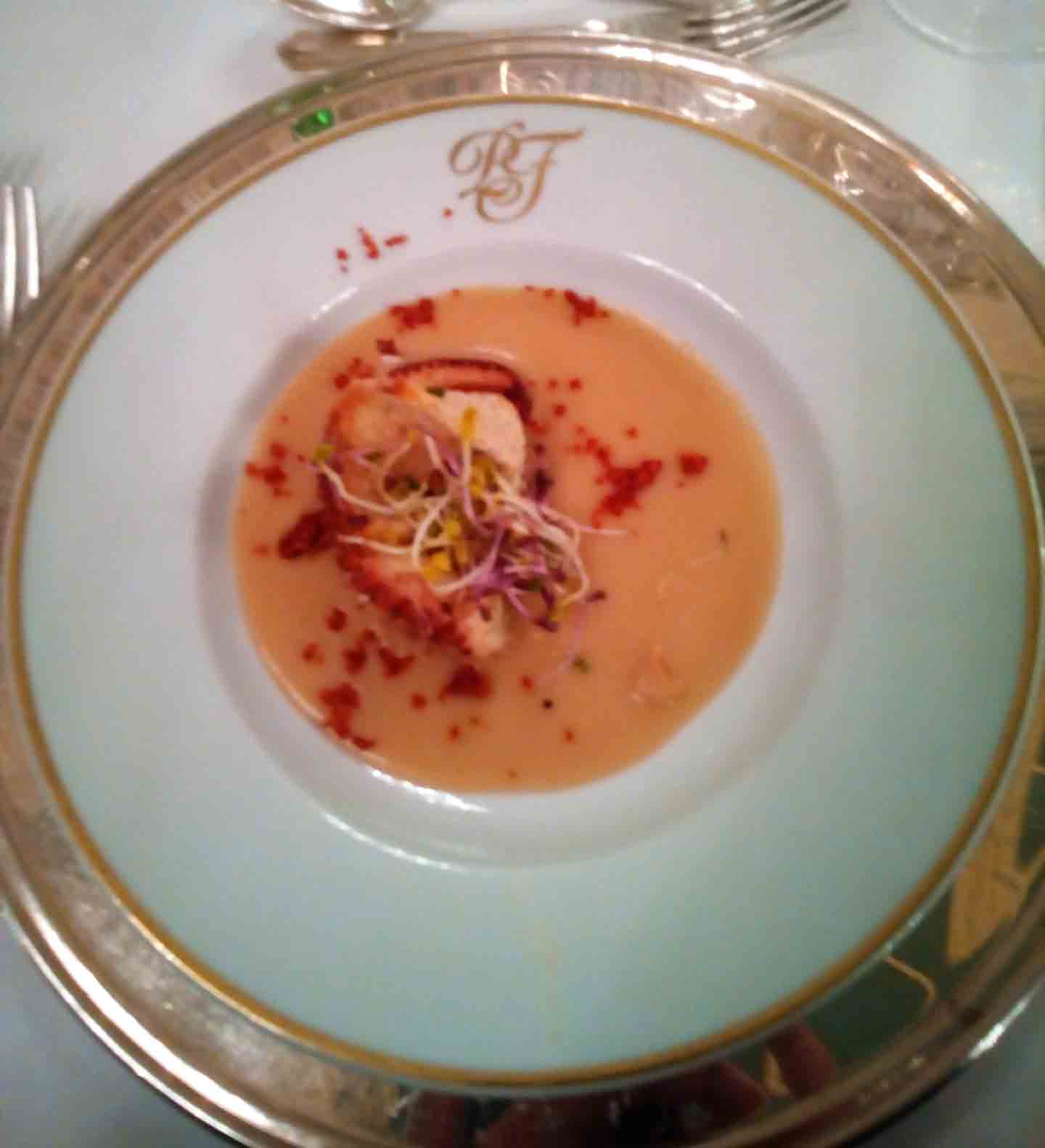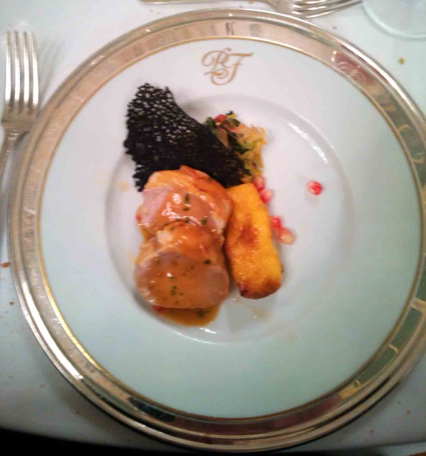 Valido e “sfizioso” il menù: antipasto di “Cremoso di Zucca con castagne al cesanese e grissino sfogliato” e “Polpo verace su vellutata di fagioli cannellini di Atina e tegola di pane”; primi piatti il “Raviolo del plin al gambero rosso e datterino giallo di Sperlonga” e il “Risotto mantecato al cremoso di radicchio trevigiano e ciambella di Morolo” (uno squisito formaggio a pasta filata e affumicata con fumo di faggio o pioppo, ottimo ingrediente della cucina ciociara.); per secondo il “Filetto di maialino in crosta di mele con polenta arrostita e verza” e poi, dulcis in fundo, una “Mousse di ricotta e pere Williams su biscotto di frolla e frutti di bosco”.