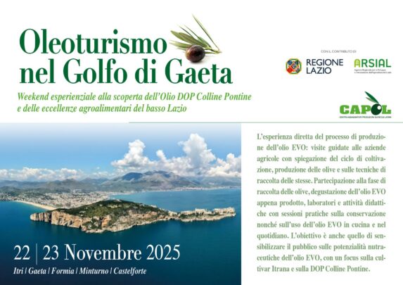 Nel fine settimana del 22 e 23 novembre il Golfo di Gaeta diventerà il palcoscenico di un viaggio dedicato all’olio extravergine di oliva e ai paesaggi che lo rendono unico. “L’Oleoturismo nel Golfo di Gaeta” porterà nei comuni di Itri, Gaeta, Formia, Minturno e Castelforte due giornate pensate per raccontare da vicino la storia, la cultura e le tecniche che accompagnano la produzione dell’olio e delle olive, con visite guidate, degustazioni, laboratori e momenti di approfondimento.
